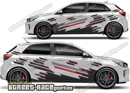 Kia Rio large graphics. They are a universal fit to suit all Kia Rio cars and facelift variants. There are no cutouts for the door handles, wheel arches or door lines; these will require trimming during fitting.