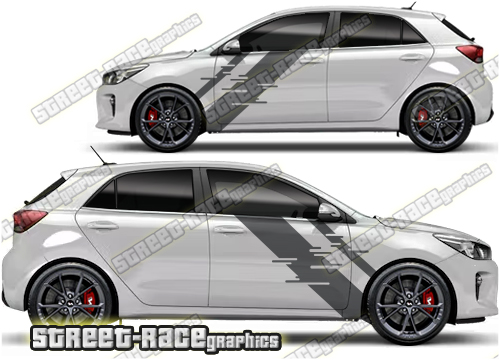 Kia Rio large graphics. They are a universal fit to suit all Kia Rio cars and facelift variants. There are no cutouts for the door handles, wheel arches or door lines; these will require trimming during fitting.