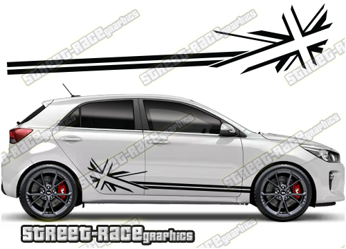 Kia Rio racing stripes. They are a universal fit to suit all Kia Rio cars and facelift variants. There are no cutouts for the wheel arches or door lines; these will require trimming during fitting.