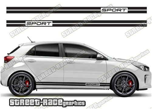 Kia Rio racing stripes. They are a universal fit to suit all Kia Rio cars and facelift variants. There are no cutouts for the wheel arches or door lines; these will require trimming during fitting.