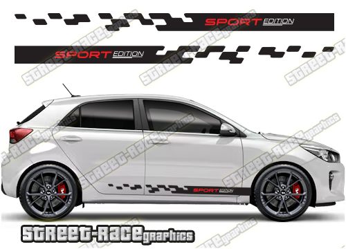 Kia Rio racing stripes. They are a universal fit to suit all Kia Rio cars and facelift variants. There are no cutouts for the wheel arches or door lines; these will require trimming during fitting.