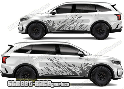 Kia Sorento graphics. They are shown on the third generation Sorento but they can be trimmed to fit all later versions and facelift variants. The decals are not pre-cut for any specific Kia Sorento version; they do not have any door handle cutouts, wheel arch or door line splits. These will require trimming during fitting. Vinyl will not stick to unpainted textured plastics.