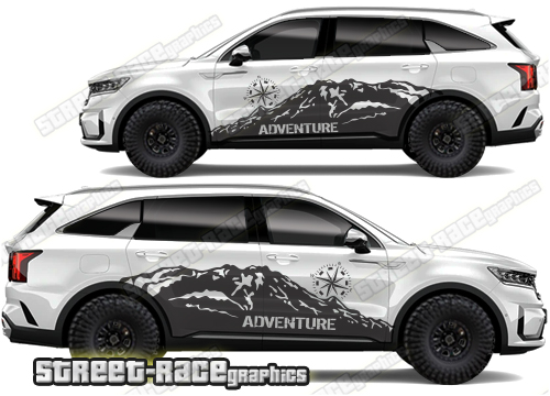 Kia Sorento graphics. They are shown on the third generation Sorento but they can be trimmed to fit all later versions and facelift variants. The decals are not pre-cut for any specific Kia Sorento version; they do not have any door handle cutouts, wheel arch or door line splits. These will require trimming during fitting. Vinyl will not stick to unpainted textured plastics.