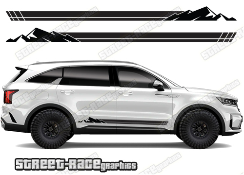 Kia Sorento racing stripes. They are shown on the third generation Sorento but they can be trimmed to fit all later versions and facelift variants. The decals are not pre-cut for any specific Kia Sorento version; they do not have any door handle cutouts, wheel arch or door line splits. These will require trimming during fitting. Vinyl will not stick to unpainted textured plastics.