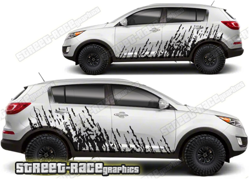 Kia Sportage graphics. They are shown on the third generation Sportage but they can be trimmed to fit all later versions and facelift variants. The decals are not pre-cut for any specific Kia Sportage version; they do not have any door handle cutouts, wheel arch or door line splits. These will require trimming during fitting. Vinyl will not stick to unpainted textured plastics.