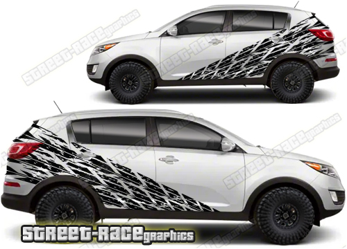 Kia Sportage graphics. They are shown on the third generation Sportage but they can be trimmed to fit all later versions and facelift variants. The decals are not pre-cut for any specific Kia Sportage version; they do not have any door handle cutouts, wheel arch or door line splits. These will require trimming during fitting. Vinyl will not stick to unpainted textured plastics.