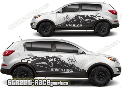 Kia Sportage graphics. They are shown on the third generation Sportage but they can be trimmed to fit all later versions and facelift variants. The decals are not pre-cut for any specific Kia Sportage version; they do not have any door handle cutouts, wheel arch or door line splits. These will require trimming during fitting. Vinyl will not stick to unpainted textured plastics.