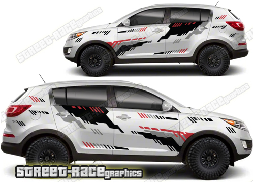 Kia Sportage graphics. They are shown on the third generation Sportage but they can be trimmed to fit all later versions and facelift variants. The decals are not pre-cut for any specific Kia Sportage version; they do not have any door handle cutouts, wheel arch or door line splits. These will require trimming during fitting. Vinyl will not stick to unpainted textured plastics.