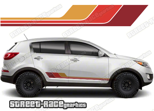 Kia Sportage racing stripes. They are shown on the third generation Sportage but they can be trimmed to fit all later versions and facelift variants. The decals are not pre-cut for any specific Kia Sportage version; they do not have any door handle cutouts, wheel arch or door line splits. These will require trimming during fitting. Vinyl will not stick to unpainted textured plastics.