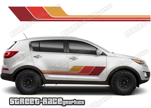 Kia Sportage racing stripes. They are shown on the third generation Sportage but they can be trimmed to fit all later versions and facelift variants. The decals are not pre-cut for any specific Kia Sportage version; they do not have any door handle cutouts, wheel arch or door line splits. These will require trimming during fitting. Vinyl will not stick to unpainted textured plastics.
