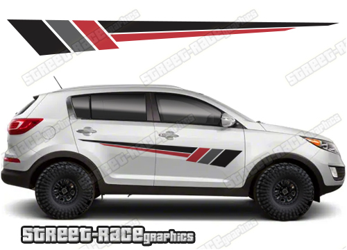 Kia Sportage racing stripes. They are shown on the third generation Sportage but they can be trimmed to fit all later versions and facelift variants. The decals are not pre-cut for any specific Kia Sportage version; they do not have any door handle cutouts, wheel arch or door line splits. These will require trimming during fitting. Vinyl will not stick to unpainted textured plastics.