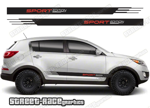 Kia Sportage racing stripes. They are shown on the third generation Sportage but they can be trimmed to fit all later versions and facelift variants. The decals are not pre-cut for any specific Kia Sportage version; they do not have any door handle cutouts, wheel arch or door line splits. These will require trimming during fitting. Vinyl will not stick to unpainted textured plastics.