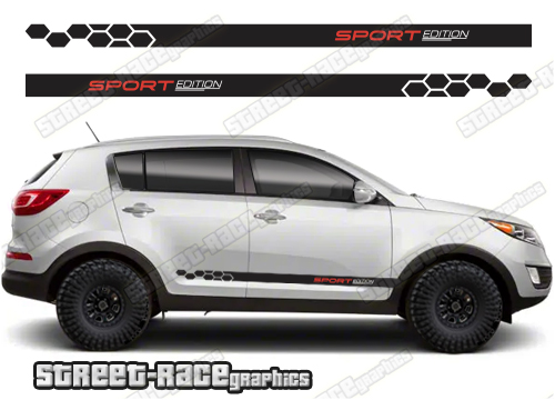 Kia Sportage racing stripes. They are shown on the third generation Sportage but they can be trimmed to fit all later versions and facelift variants. The decals are not pre-cut for any specific Kia Sportage version; they do not have any door handle cutouts, wheel arch or door line splits. These will require trimming during fitting. Vinyl will not stick to unpainted textured plastics.