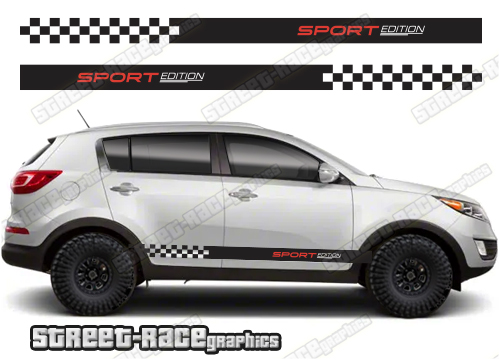 Kia Sportage racing stripes. They are shown on the third generation Sportage but they can be trimmed to fit all later versions and facelift variants. The decals are not pre-cut for any specific Kia Sportage version; they do not have any door handle cutouts, wheel arch or door line splits. These will require trimming during fitting. Vinyl will not stick to unpainted textured plastics.