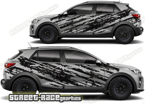 Kia Stonic graphics. They are shown on the first generation Stonic but they can be trimmed to fit all later versions and facelift variants. The decals are not pre-cut for any specific Kia Stonic version; they do not have any door handle cutouts, wheel arch or door line splits. These will require trimming during fitting. Vinyl will not stick to unpainted textured plastics.