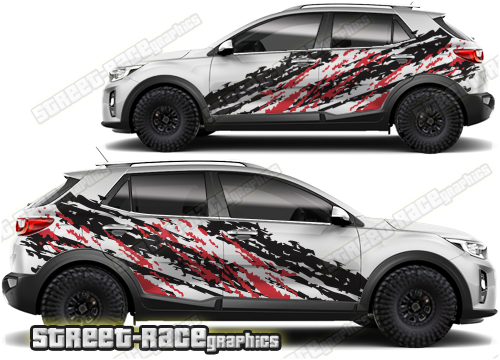 Kia Stonic graphics. They are shown on the first generation Stonic but they can be trimmed to fit all later versions and facelift variants. The decals are not pre-cut for any specific Kia Stonic version; they do not have any door handle cutouts, wheel arch or door line splits. These will require trimming during fitting. Vinyl will not stick to unpainted textured plastics.