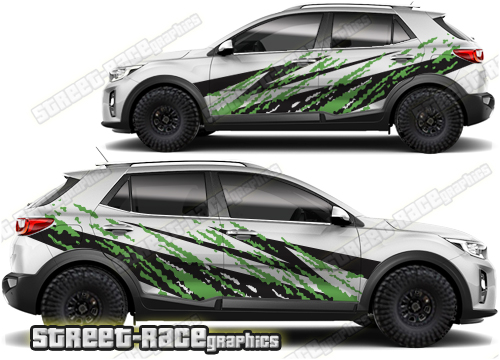 Kia Stonic graphics. They are shown on the first generation Stonic but they can be trimmed to fit all later versions and facelift variants. The decals are not pre-cut for any specific Kia Stonic version; they do not have any door handle cutouts, wheel arch or door line splits. These will require trimming during fitting. Vinyl will not stick to unpainted textured plastics.