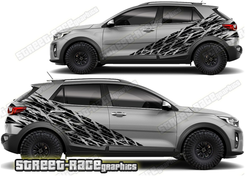 Kia Stonic graphics. They are shown on the first generation Stonic but they can be trimmed to fit all later versions and facelift variants. The decals are not pre-cut for any specific Kia Stonic version; they do not have any door handle cutouts, wheel arch or door line splits. These will require trimming during fitting. Vinyl will not stick to unpainted textured plastics.