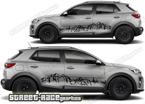 Kia Stonic graphics. They are shown on the first generation Stonic but they can be trimmed to fit all later versions and facelift variants. The decals are not pre-cut for any specific Kia Stonic version; they do not have any door handle cutouts, wheel arch or door line splits. These will require trimming during fitting. Vinyl will not stick to unpainted textured plastics.