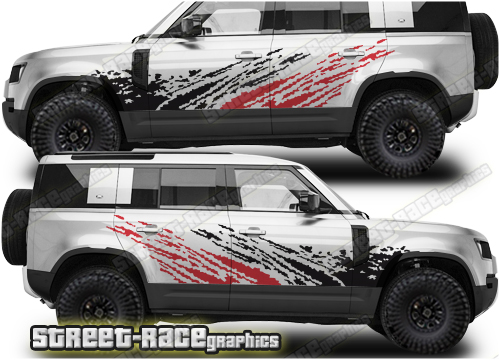 Land Rover Defender 110 graphics. They are shown on the 2020 Defender (L663). The decals are universal fit: they are not pre-cut for any specific Defender 110 L663. They do not have any door handle cutouts, wheel arch or door line splits. These will require trimming during fitting.