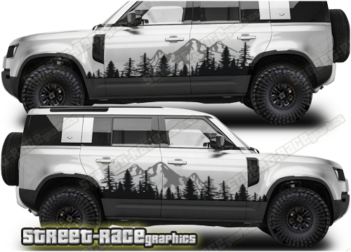 Land Rover Defender 110 graphics. They are shown on the 2020 Defender (L663). The decals are universal fit: they are not pre-cut for any specific Defender 110 L663. They do not have any door handle cutouts, wheel arch or door line splits. These will require trimming during fitting.