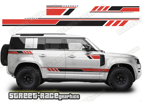 Land Rover Defender 110 graphics. They are shown on the 2020 Defender (L663). The decals are universal fit: they are not pre-cut for any specific Defender 110 L663. They do not have any door handle cutouts, wheel arch or door line splits. These will require trimming during fitting.