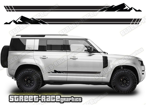 Land Rover Defender 110 graphics. They are shown on the 2020 Defender (L663). The decals are universal fit: they are not pre-cut for any specific Defender 110 L663. They do not have any door handle cutouts, wheel arch or door line splits. These will require trimming during fitting.
