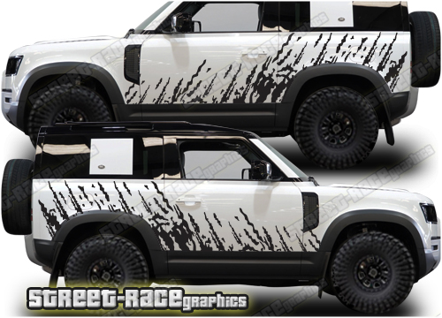 Land Rover Defender 90 graphics. They are shown on the 2020 Defender (L663). The decals are universal fit: they are not pre-cut for any specific Defender 90 L663. They do not have any door handle cutouts, wheel arch or door line splits. These will require trimming during fitting.