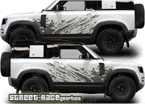 Land Rover Defender 90 graphics. They are shown on the 2020 Defender (L663). The decals are universal fit: they are not pre-cut for any specific Defender 90 L663. They do not have any door handle cutouts, wheel arch or door line splits. These will require trimming during fitting.