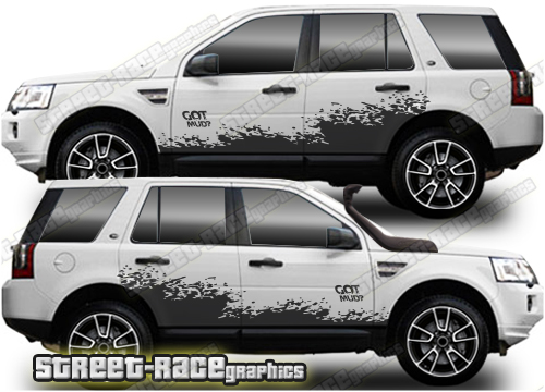 Land Rover Freelander graphics. They are shown on the first generation Land Rover Freelander but they will fit any Freelander 1 or 2. The decals are universal fit: they are not pre-cut for any specific Freelander 1 or 2. They do not have any door handle cutouts, wheel arch or door line splits. These will require trimming during fitting.