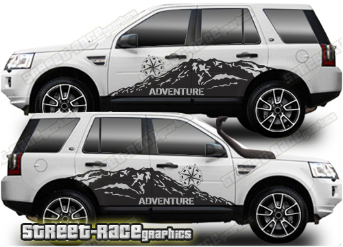 Land Rover Freelander graphics. They are shown on the first generation Land Rover Freelander but they will fit any Freelander 1 or 2. The decals are universal fit: they are not pre-cut for any specific Freelander 1 or 2. They do not have any door handle cutouts, wheel arch or door line splits. These will require trimming during fitting.