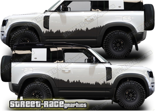 Land Rover Defender 90 graphics. They are shown on the 2020 Defender (L663). The decals are universal fit: they are not pre-cut for any specific Defender 90 L663. They do not have any door handle cutouts, wheel arch or door line splits. These will require trimming during fitting.