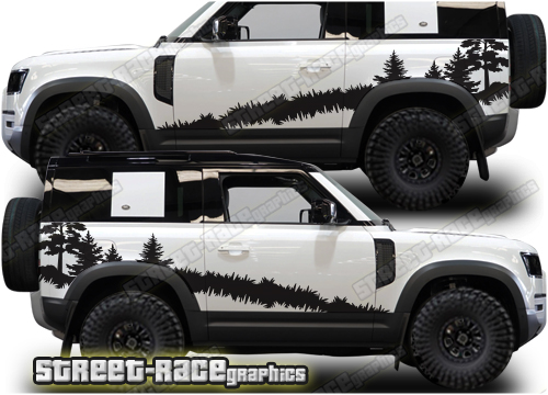 Land Rover Defender 90 graphics. They are shown on the 2020 Defender (L663). The decals are universal fit: they are not pre-cut for any specific Defender 90 L663. They do not have any door handle cutouts, wheel arch or door line splits. These will require trimming during fitting.