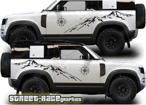Land Rover Defender 90 graphics. They are shown on the 2020 Defender (L663). The decals are universal fit: they are not pre-cut for any specific Defender 90 L663. They do not have any door handle cutouts, wheel arch or door line splits. These will require trimming during fitting.