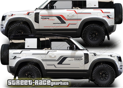 Land Rover Defender 90 graphics. They are shown on the 2020 Defender (L663). The decals are universal fit: they are not pre-cut for any specific Defender 90 L663. They do not have any door handle cutouts, wheel arch or door line splits. These will require trimming during fitting.