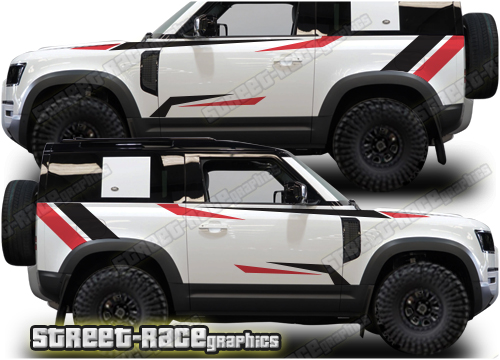 Land Rover Defender 90 graphics. They are shown on the 2020 Defender (L663). The decals are universal fit: they are not pre-cut for any specific Defender 90 L663. They do not have any door handle cutouts, wheel arch or door line splits. These will require trimming during fitting.