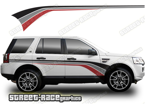 Land Rover Freelander racing stripes. They are shown on the first generation Land Rover Freelander but they will fit any Freelander 1 or 2. The decals are universal fit: they are not pre-cut for any specific Freelander 1 or 2. They do not have any door handle cutouts, wheel arch or door line splits. These will require trimming during fitting.