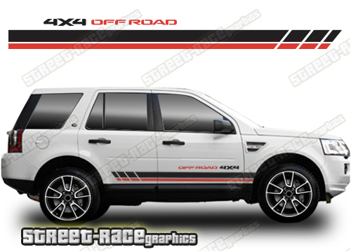 Land Rover Freelander racing stripes. They are shown on the first generation Land Rover Freelander but they will fit any Freelander 1 or 2. The decals are universal fit: they are not pre-cut for any specific Freelander 1 or 2. They do not have any door handle cutouts, wheel arch or door line splits. These will require trimming during fitting.