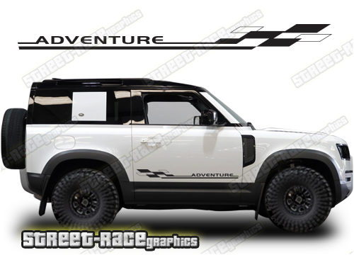 Land Rover Defender 90 racing stripes. They are shown on the 2020 Defender (L663). The decals are universal fit: they are not pre-cut for any specific Defender 90 L663. They do not have any cutouts for the wheel arches or door line splits. These will require trimming during fitting.