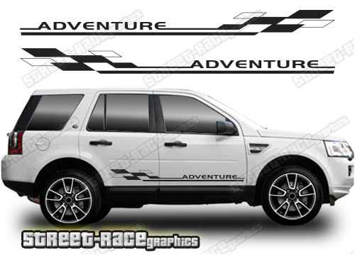 Land Rover Freelander racing stripes. They are shown on the first generation Land Rover Freelander but they will fit any Freelander 1 or 2. The decals are universal fit: they are not pre-cut for any specific Freelander 1 or 2. They do not have any door handle cutouts, wheel arch or door line splits. These will require trimming during fitting.