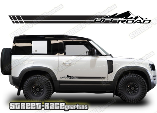 Land Rover Defender 90 racing stripes. They are shown on the 2020 Defender (L663). The decals are universal fit: they are not pre-cut for any specific Defender 90 L663. They do not have any cutouts for the wheel arches or door line splits. These will require trimming during fitting.