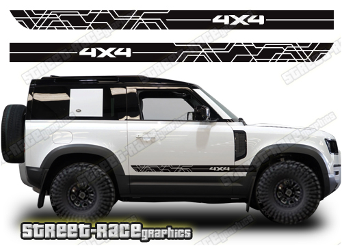 Land Rover Defender 90 racing stripes. They are shown on the 2020 Defender (L663). The decals are universal fit: they are not pre-cut for any specific Defender 90 L663. They do not have any cutouts for the wheel arches or door line splits. These will require trimming during fitting.