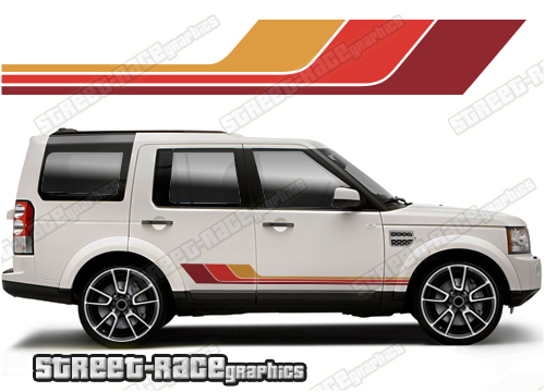 Land Rover Discovery racing stripes. They are shown on the third generation Land Rover Discovery but they will fit any Discovery 3 or 4. The decals are universal fit: they are not pre-cut for any specific Discovery 3 or 4. They do not have any door handle cutouts, wheel arch or door line splits. These will require trimming during fitting.