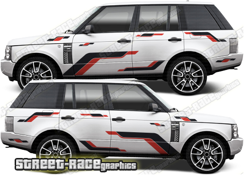 Range Rover graphics. They are shown on the third generation Range Rover but they will fit any Range Rover 3 or 4 (L322 or L405). The decals are universal fit: they are not pre-cut for any specific Range Rover 3 or 4. They do not have any door handle cutouts, wheel arch or door line splits. These will require trimming during fitting.
