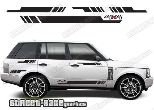 Range Rover racing stripes. They are shown on the third generation Range Rover but they will fit any Range Rover 3 or 4 (L322 or L405). The decals are universal fit: they are not pre-cut for any specific Range Rover 3 or 4. They do not have any door handle cutouts, wheel arch or door line splits. These will require trimming during fitting.
