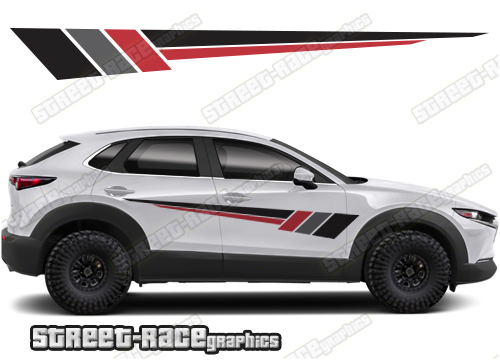 Mazda CX-30 racing stripes. They are shown on the second generation CX-30 but they can be trimmed to fit all later versions and facelift variants. The decals are not pre-cut for any specific Mazda CX-30 version; they do not have any door handle cutouts, wheel arch or door line splits. These will require trimming during fitting. Vinyl will not stick to unpainted textured plastics.
