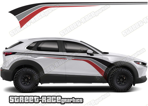 Mazda CX-30 racing stripes. They are shown on the second generation CX-30 but they can be trimmed to fit all later versions and facelift variants. The decals are not pre-cut for any specific Mazda CX-30 version; they do not have any door handle cutouts, wheel arch or door line splits. These will require trimming during fitting. Vinyl will not stick to unpainted textured plastics.