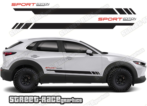 Mazda CX-30 racing stripes. They are shown on the second generation CX-30 but they can be trimmed to fit all later versions and facelift variants. The decals are not pre-cut for any specific Mazda CX-30 version; they do not have any door handle cutouts, wheel arch or door line splits. These will require trimming during fitting. Vinyl will not stick to unpainted textured plastics.