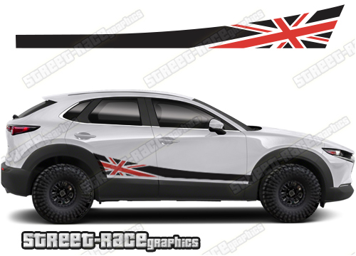 Mazda CX-30 racing stripes. They are shown on the second generation CX-30 but they can be trimmed to fit all later versions and facelift variants. The decals are not pre-cut for any specific Mazda CX-30 version; they do not have any door handle cutouts, wheel arch or door line splits. These will require trimming during fitting. Vinyl will not stick to unpainted textured plastics.