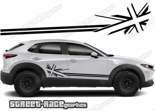 Mazda CX-30 racing stripes. They are shown on the second generation CX-30 but they can be trimmed to fit all later versions and facelift variants. The decals are not pre-cut for any specific Mazda CX-30 version; they do not have any door handle cutouts, wheel arch or door line splits. These will require trimming during fitting. Vinyl will not stick to unpainted textured plastics.